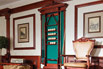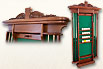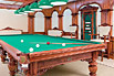 A large four cue wall-mounted rack. All the cues are positioned bolt upright to preserve their linearity. Four little shelves are designed to accommodate the balls and keep the score during the game, while the upper cue rack part has a special hanger to hold the triangle.