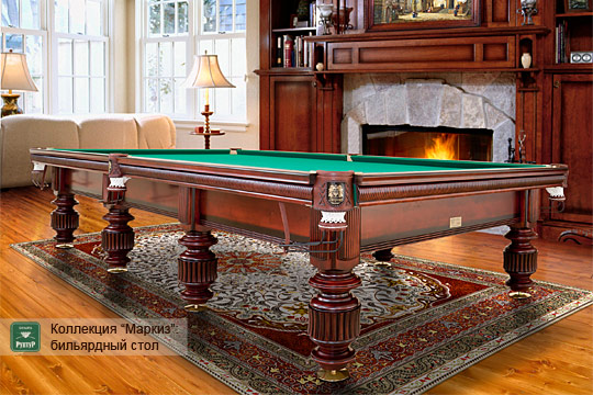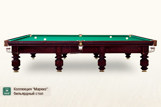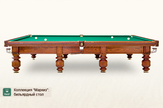 An elegant billiard table with chiselled legs and lush top rail jabots. It is intended for classical style admirers and manufactured in a strict compliance with all the applicable sporting standards.