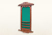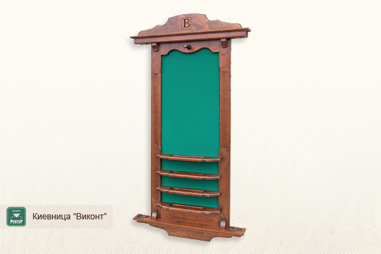A large four cue wall-mounted rack. All the cues are positioned bolt upright to preserve their linearity. Four little shelves are designed to accommodate the balls and keep the score during the game, while the upper cue rack part has a special hanger to hold the triangle.
