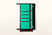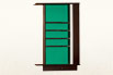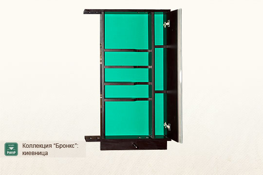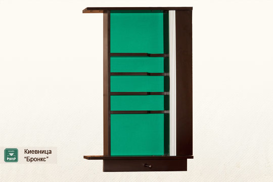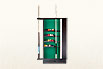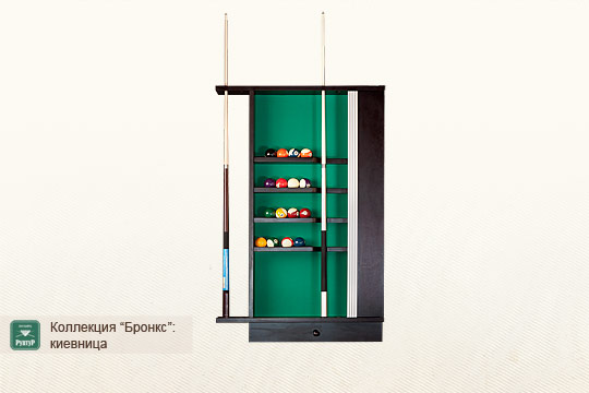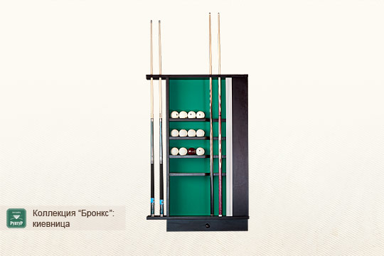 A large four cue wall-mounted rack. All the cues are positioned bolt upright to preserve their linearity. Four little shelves are designed to accommodate the balls and keep the score during the game, while the bottom cue rack part has a special hanger to hold the triangle.