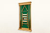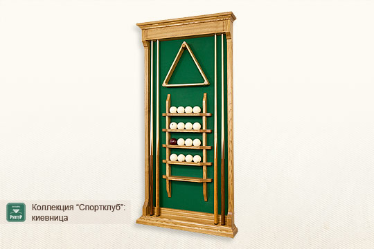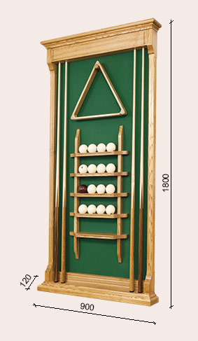A large four cue wall-mounted rack. All the cues are positioned bolt upright to preserve their linearity. Four little shelves are designed to accommodate the balls and keep the score during the game, while the upper cue rack part has a special hanger to hold the triangle.