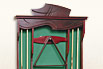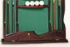 A large four cue wall-mounted rack. All the cues are positioned bolt upright to preserve their linearity. Four little shelves are designed to accommodate the balls and keep the score during the game, while the upper cue rack part has a special hanger to hold the triangle.